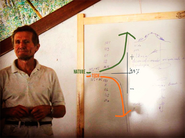 "Nature uses for its metabolic processes approx 3% of its capital in order to achieve a 10 to 15% surplus." This means, nature (green line above) will always increase its energy (syntropy) since it produces more than it consumes. Technology on the contrary will always tend towards energy depletion since to achieve the same surplus of 10%, a combustion engine, for instance, burns between 70-75% of its fuel energy, that is, it consumes more than it produces and will always need energy added to its system (entropy). Technology will never lead to abundance, nature will.
